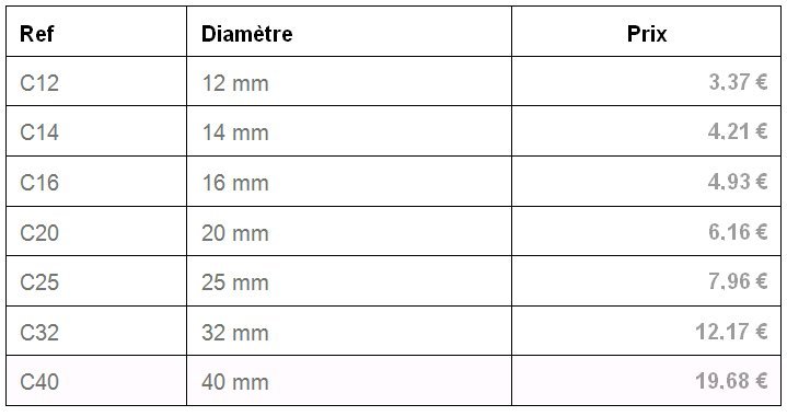 Prix des manchons en fonction du diamètre des barres